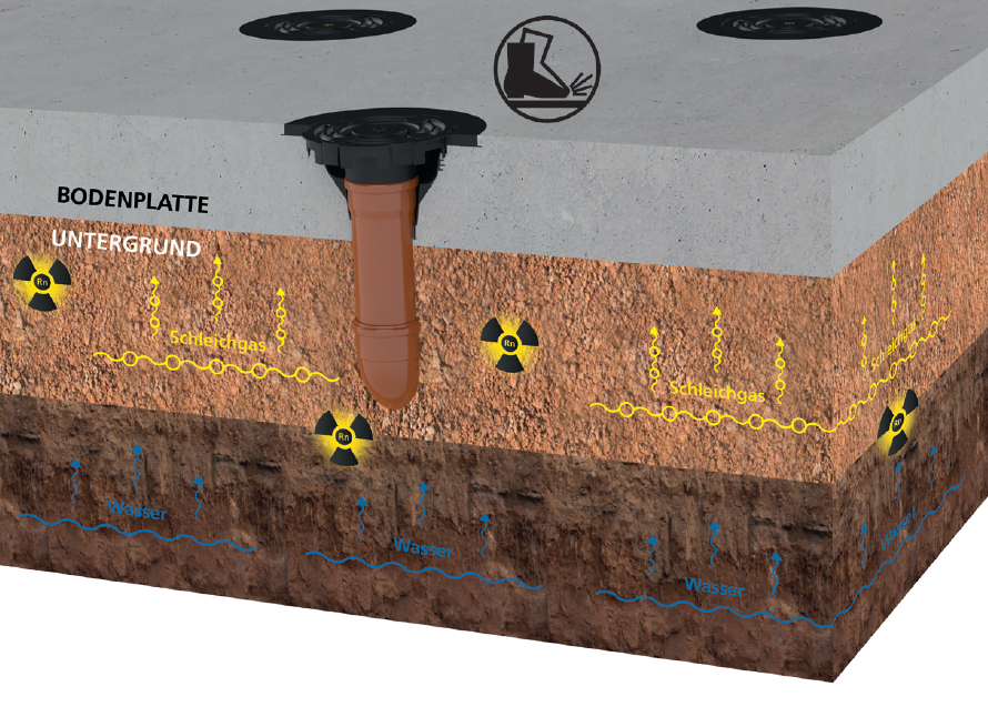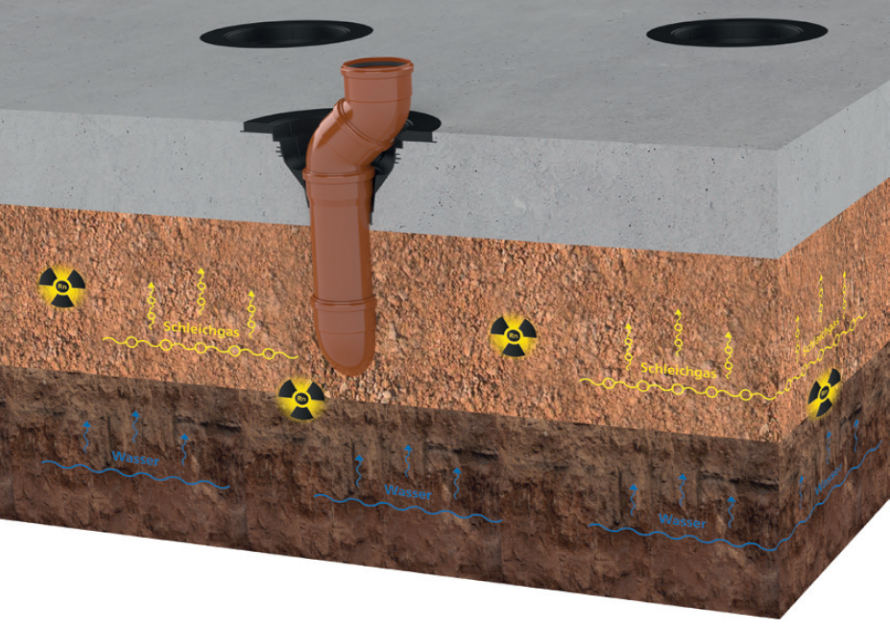 Eigenschaften und technische Daten: lieferbar in DN 100 (Außendurchmesser 110 mm) Auslieferung inkl. Verschlussdeckel als Schutz gegen Beton und Schmutz, trittsicher und stolperfrei Trichter ø innen = 250 mm, ø aussen = 370 mm maximaler Versatz 90 mm • Anschlusstrichter aus ABS WU-Beton Beanspruchungsklasse 1, Beanspruchungsklasse 2 DIN 18533 W1.1-E, Bodenfeuchte Gas- und wasserdichte Verbindung mit der Bodenplatte dank integrierter Dreistegdichtung KIWA-Geprüft aus Radondichtem ABS - Kunststoff mit integrierter Libelle zur lagemäßigen Ausrichtung des Anschlußtrichters kann zur Bodenplattenentwässerung während der Bauphase verwendet werden; integrierte Schmutzfangrillen